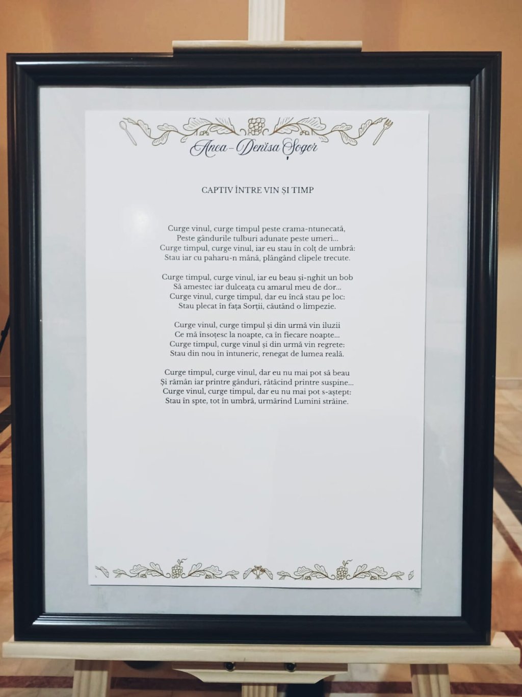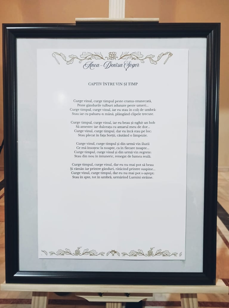 La final, publicul prezent în sală a putut admira și citi versurile expuse pe șevalete (semnate de autorii care au participat la concursul de poezie bahică „Vin în Vrancea”). Printre poeziile înscrise s-a numărat și creația mea, intitulată Captiv între Vin și Timp. Poezia reflectă tema concursului prin modul în care surprinde profunzimea unor emoții ce iau naștere, sunt potențate ori sunt readuse la suprafață sub influența vinului, păstrând nota ușor pesimistă, nostalgică și gânditoare specifică unui suflet vulnerabil, presat de alegerile din trecut, care acum se simte incapabil să-și depășească condiția.