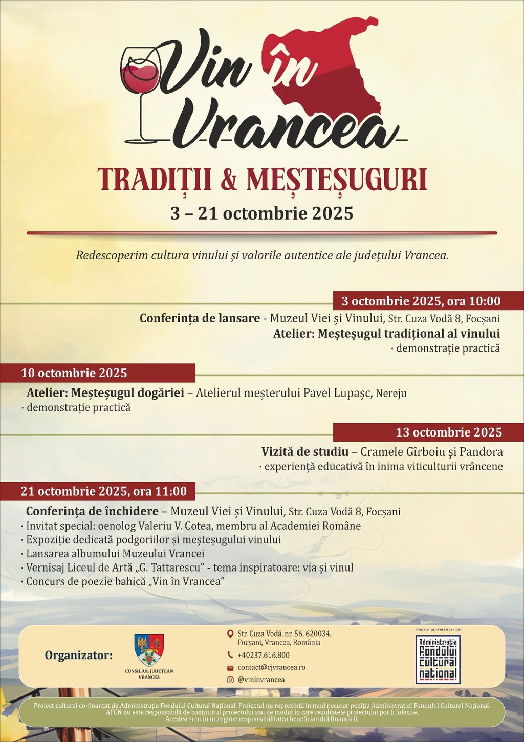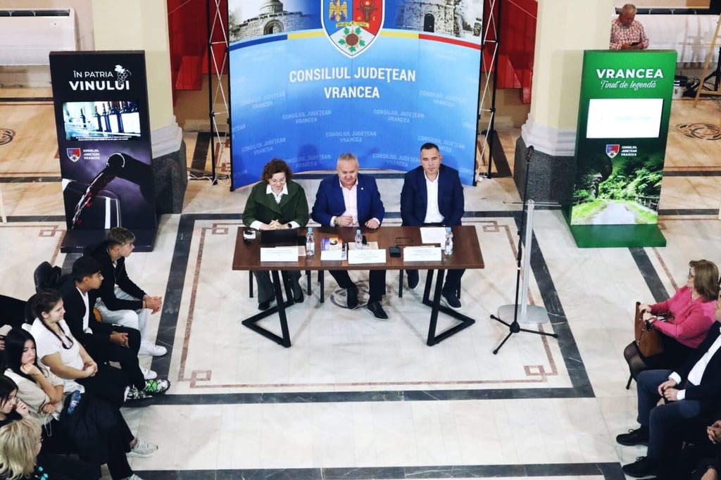 Astăzi, în foyerul Muzeului Viei și Vinului din Focșani, s-a organizat ultima etapă a proiectului Consiliului Județean Vrancea, ce a avut drept parteneri Muzeul Vrancei, Biblioteca Județeană „Duiliu Zamfirescu”, Centrul Cultural Vrancea, Liceul de Agricultură și Industrie Alimentară din Odobești, Liceul de Artă „Gh. Tattarescu" din Focșani și Colegiul Tehnic „Valeriu V. Cotea" din Focșani.